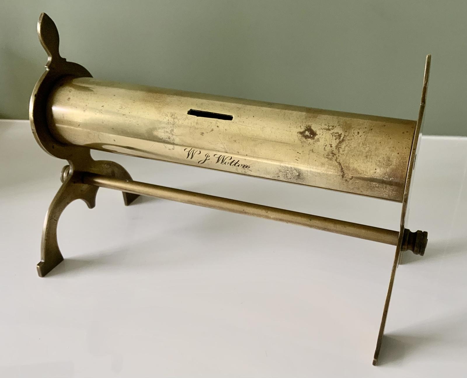 19th Century antique brass Alms collection box. Original owners name to the front W J Wotton. Presume this would have sat in his home maybe in a hallway and he and others visiting could donate to the Alms House. Very well made good heavy guage of brass. One end unscrews so that the money can be removed. A brass rod holds the box together.