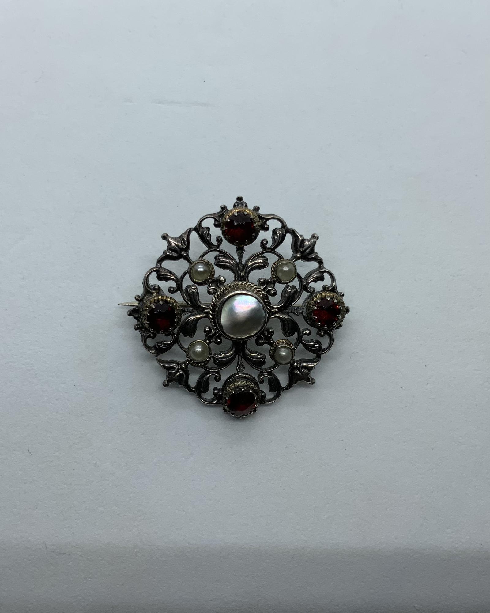A very pretty 19th Century silver, pearl & garnet brooch.