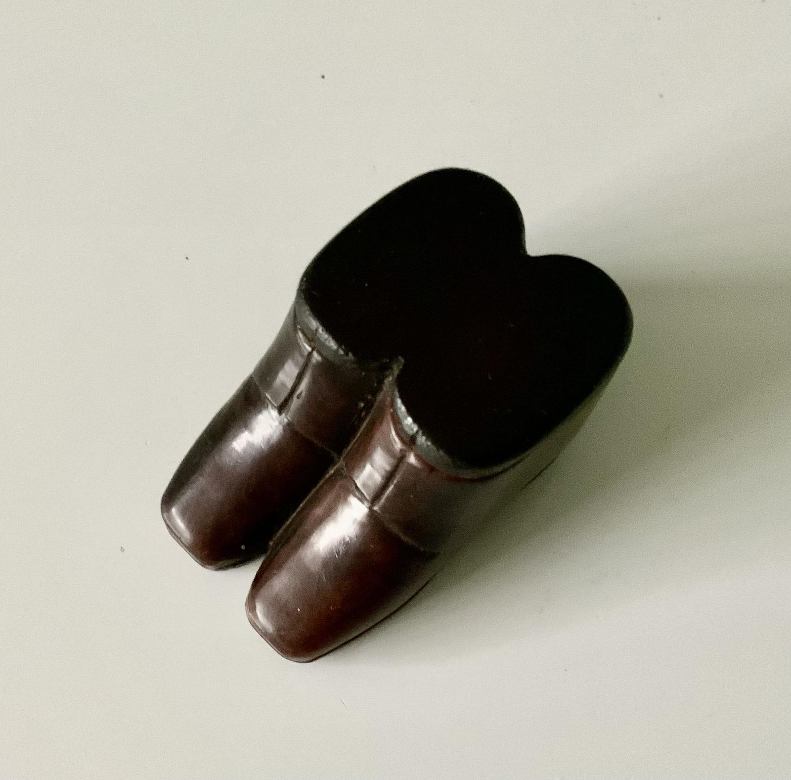 This is the most charming item, and a rare survivor. It is a lovely rich colour and great patination. I think it may have been given as a love token as shoes were very popular for this and represented good luck.