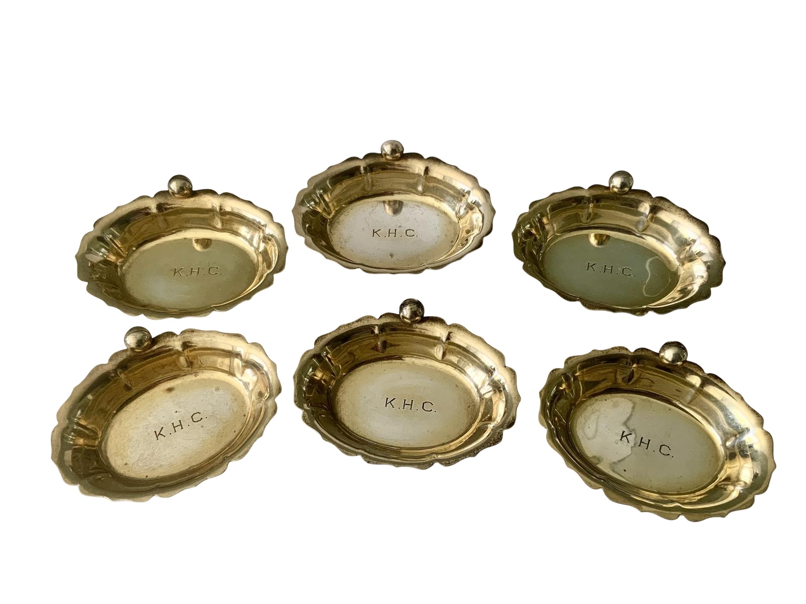 A set of 6 sterling silver gilt American menu/place name holder dishes.