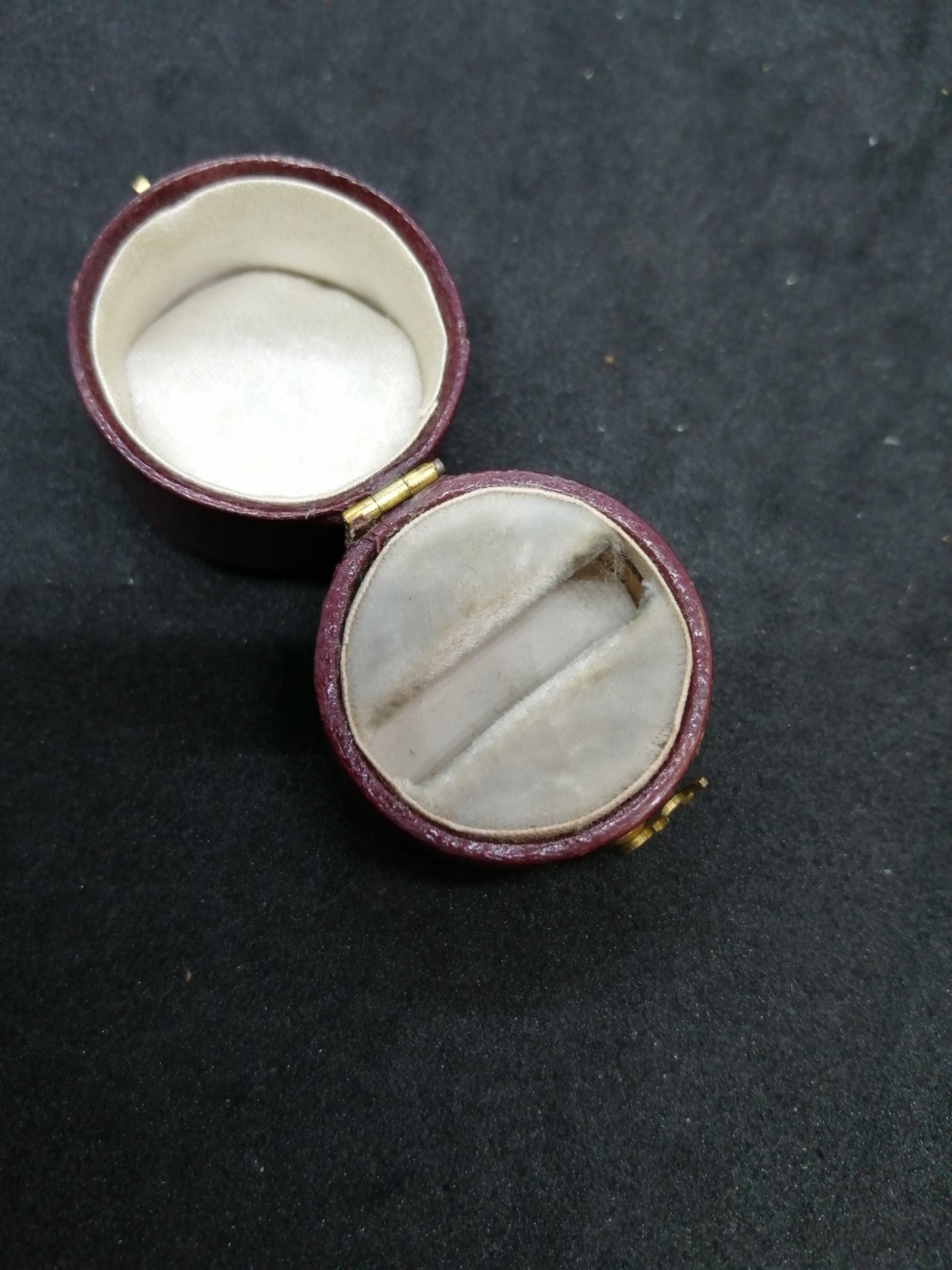A lovely example of a 19th century ring box which has a wider fitting inside so it will take a larger width ring. Outside is red leather, inside cream silk and a very pale blue velvet. Closes with a hook fastening.