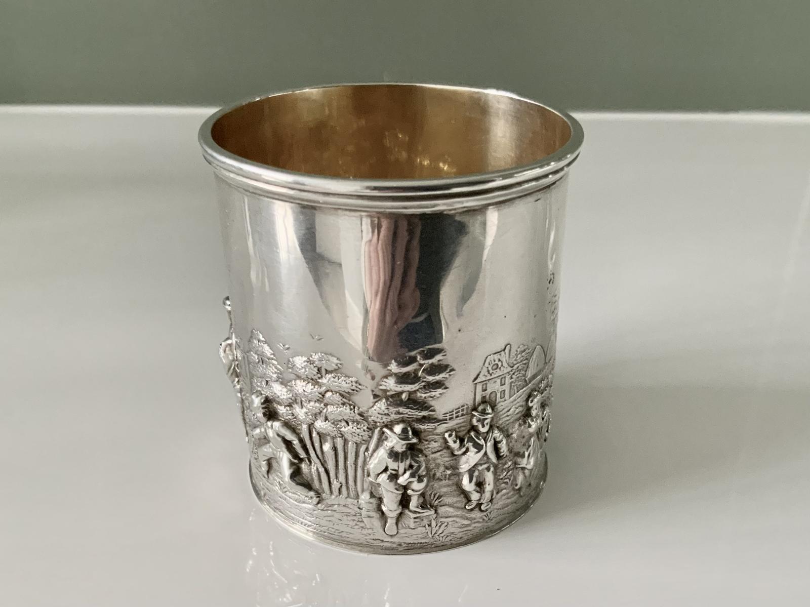 A beautiful Chester silver christening mug with super decoration of raised figures around the mug. Chester 1904 Nathan & Hayes. The gilding to the interior is really good.