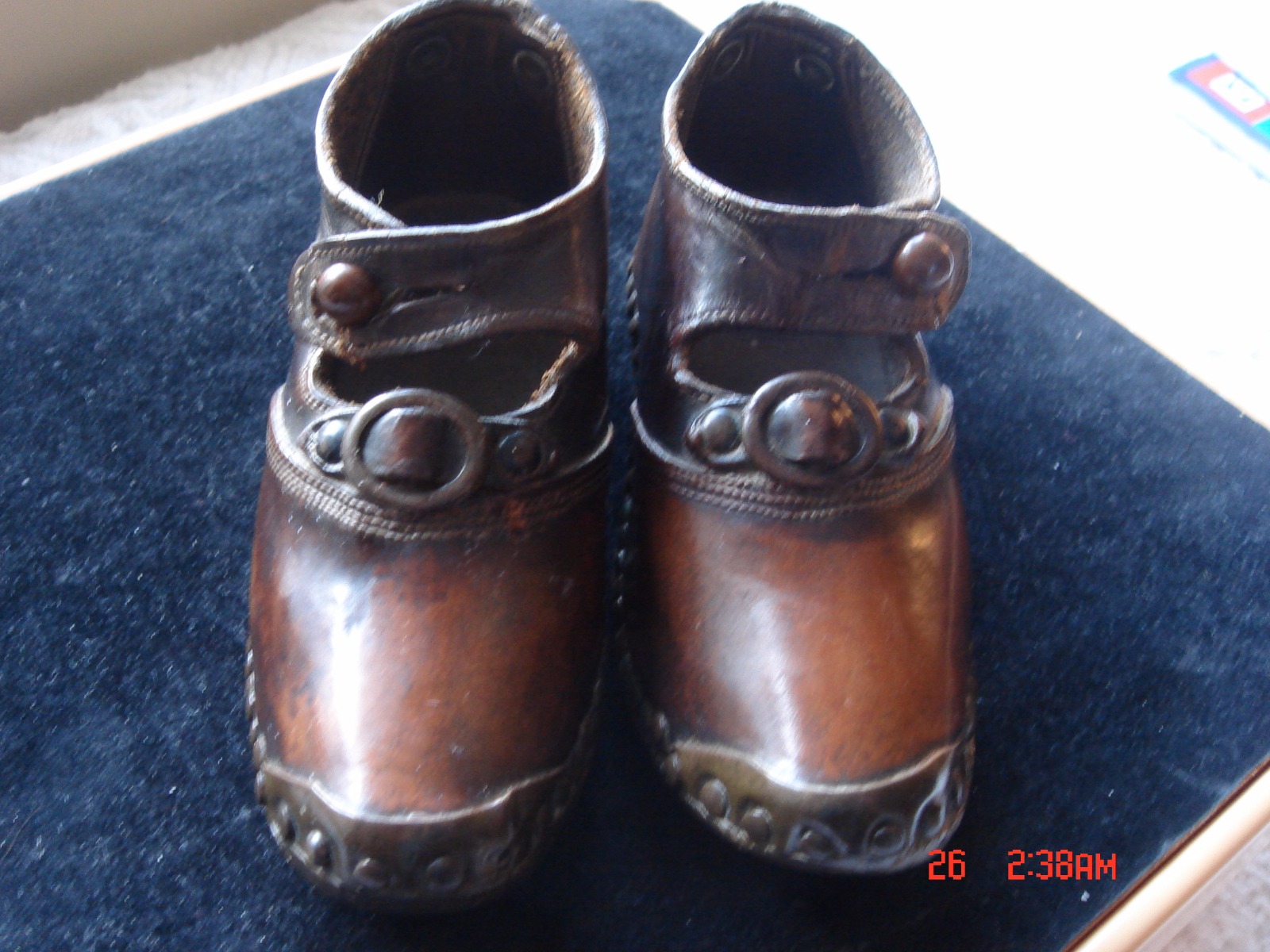 These are a super pair of either childrens clogs or salesman sample. The detail on these delightful clogs is just amazing. They are late 19th early 20th century, the leather is of a top quality and in really good condition. The detailing of the buckle on the front and the top stitching is just lovely. If you are a collector of shoes then these would make a wonderful addition to your collection. They measure 13cm long. The button fastenings are present but are delicate and may have had a little repair.
