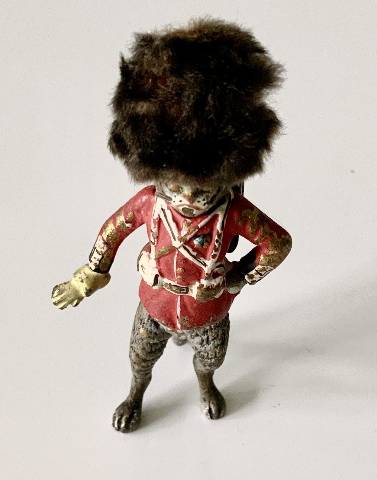 Circa 1900 cold painted bronze cat dressed in the uniform of the Grenadier Guard. Lots of original paint, stands well, wear to hat.