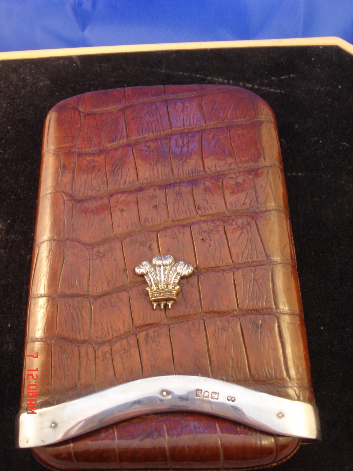 Quality Crocodile cigar case with Prince of Wales feathers on the front in silver and gold coloured metal. The cigar case has a silver trim marked for London 1908. Makers mark FS.
