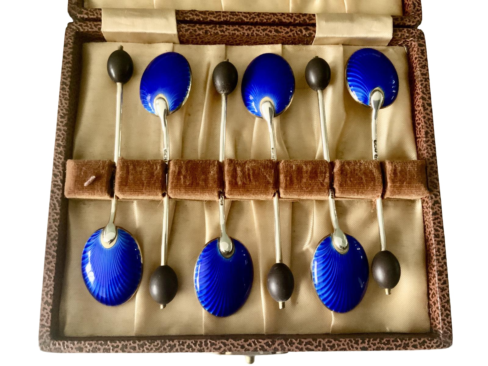 A boxed set of silver and enamel demitasse spoons in original box. A very vibrant blue enamel, no damage. Each spoon marked for Birmingham 1930 makers mark William Suckling. Coffee bean finials