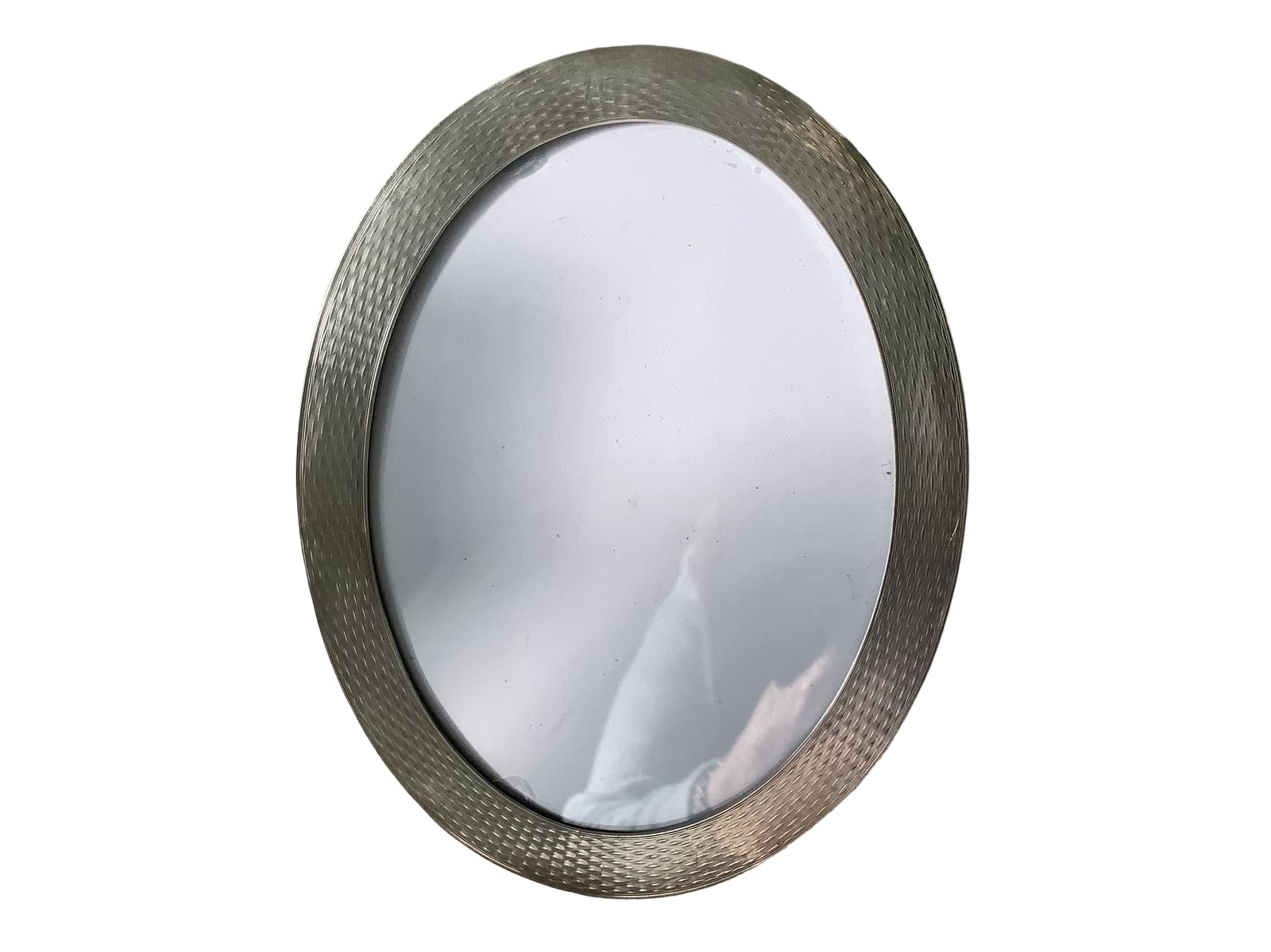 An oval early 20th century silver photograph frame. The frame is decorated with engine turning which is in lovely condition. It has its original oak backing and the small silver tags on the reverse are marked with the lion passant. The ribbon behind the strut is an addition to allow it to stand up. Birmingham 1919 DBros. Aperture for photograph 10.5 x 14.5 cm