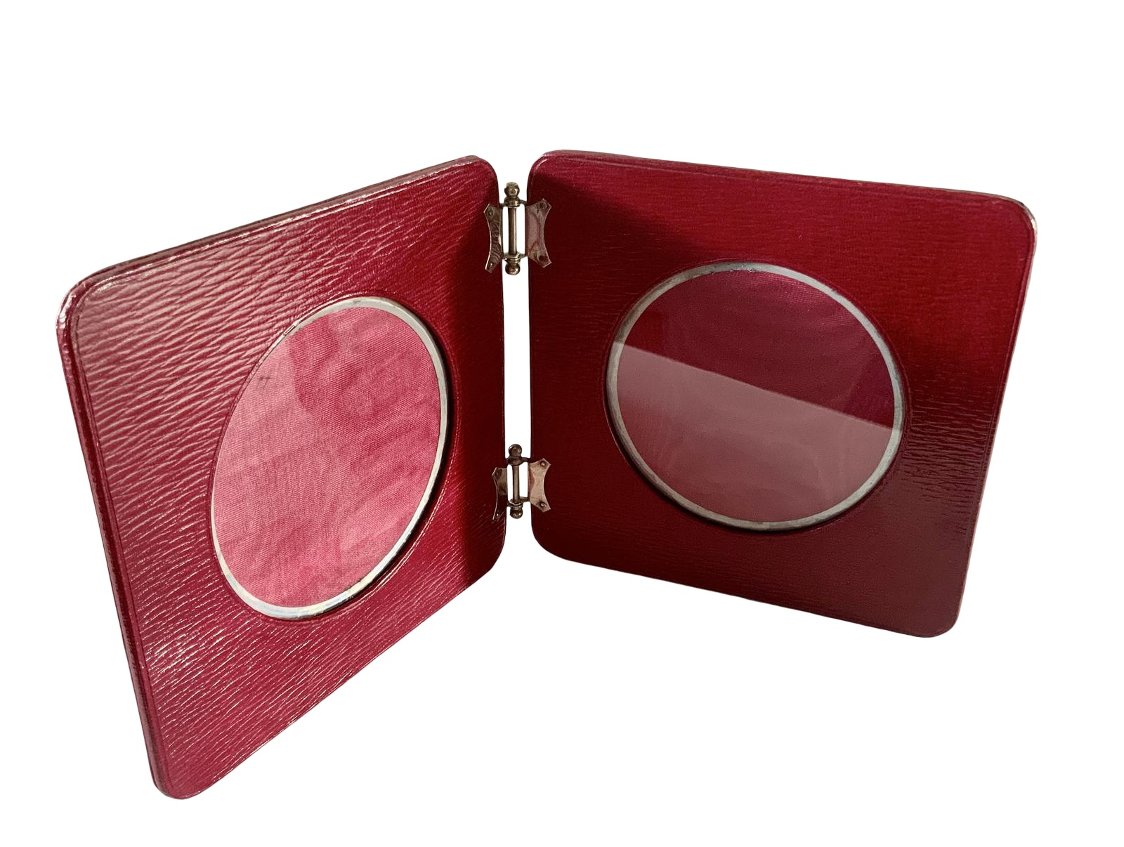 An early 20th century double folding leather photograph frame. Lovely quality leather, metal hinges. Original glass inside, original silk lining behind the glass. The photographs are inserted at the bottom of the frames.