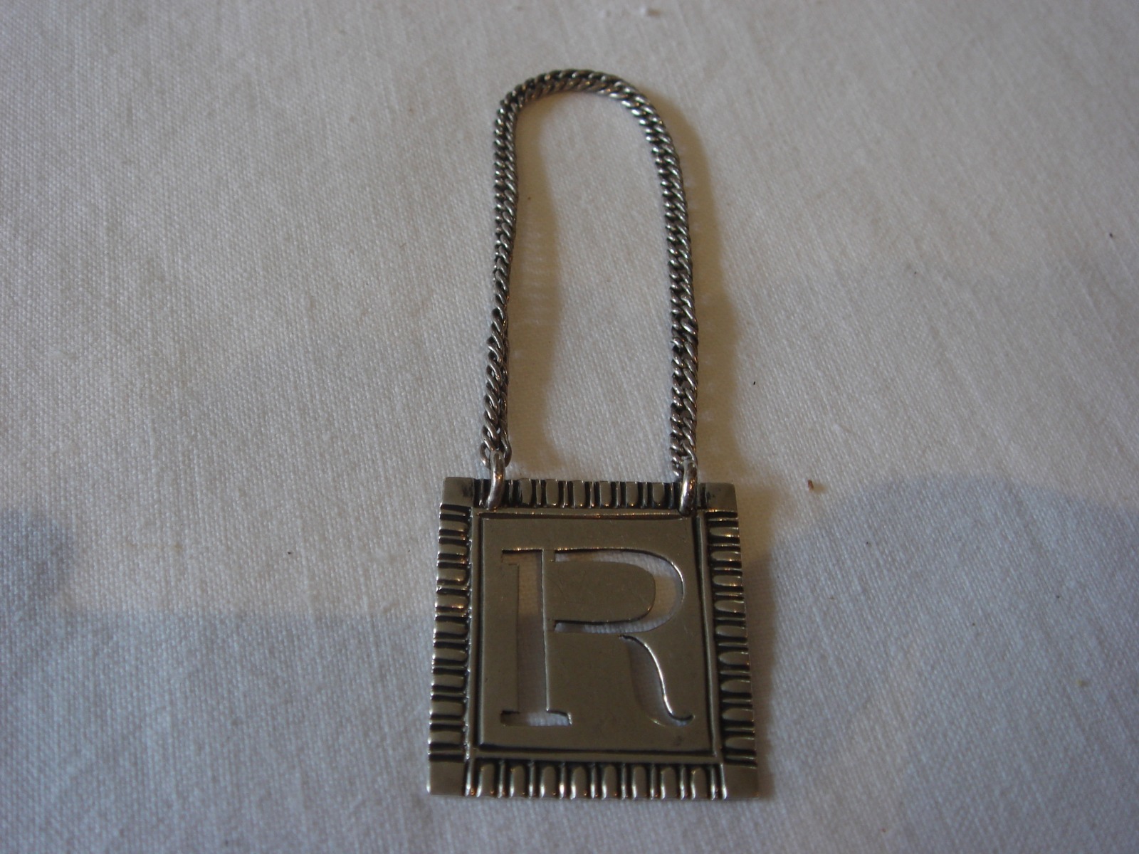 A wonderful square shaped R for Rum label, marked on back for London 1812. The makers mark is partly obliterated due to the cutting out of the R.