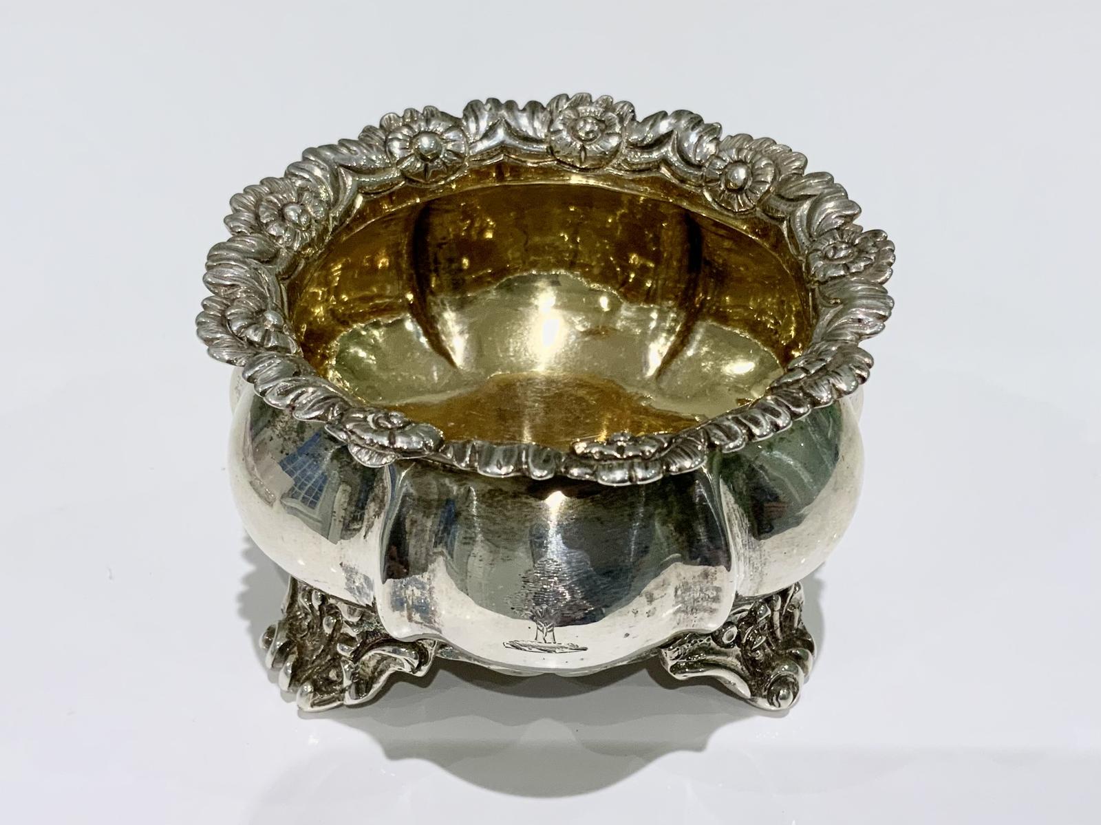 A super Georgian silver salt. Great marks to the base for London 1821 maker John Wakefield. Original gilding to the inside which is in great order. Family crest. Weight 4.96 ozt