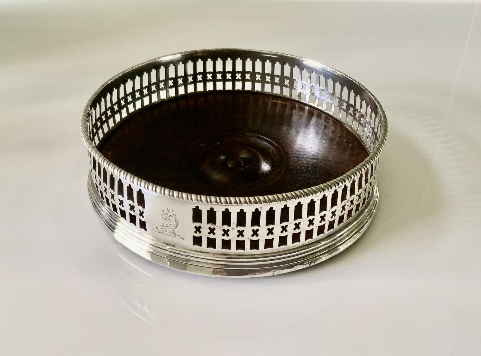 A good example of an 18th century Georgian silver wine coaster. No breaks or repairs. Family crest to front. Good colour and patination. Wooden base.