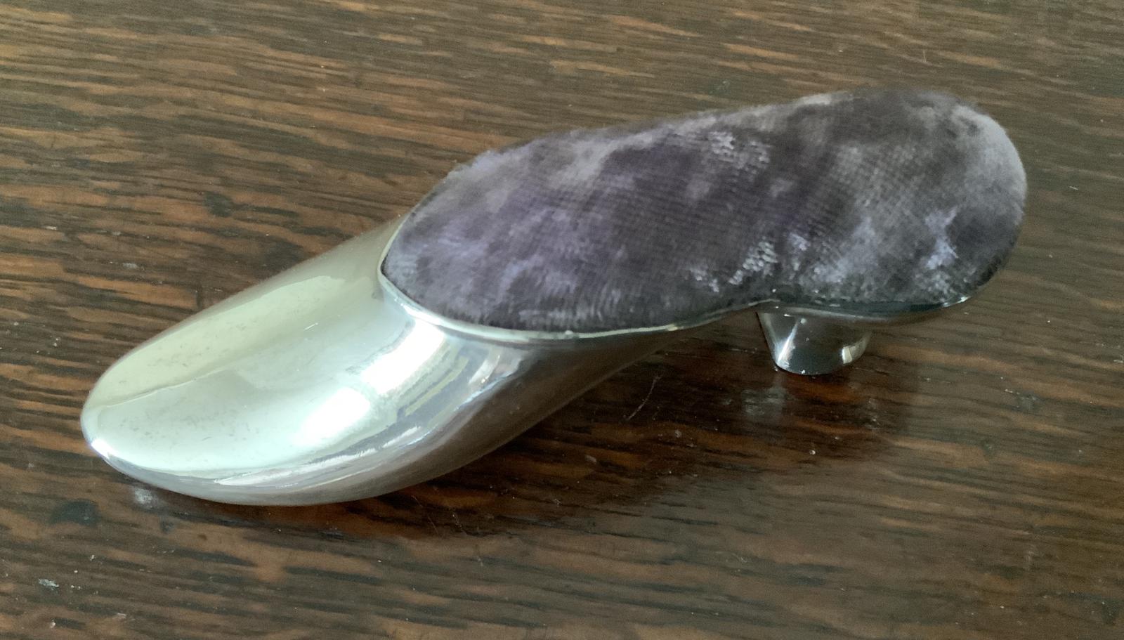 A large silver pin cushion in the form of a rather elegant ladies shoe.