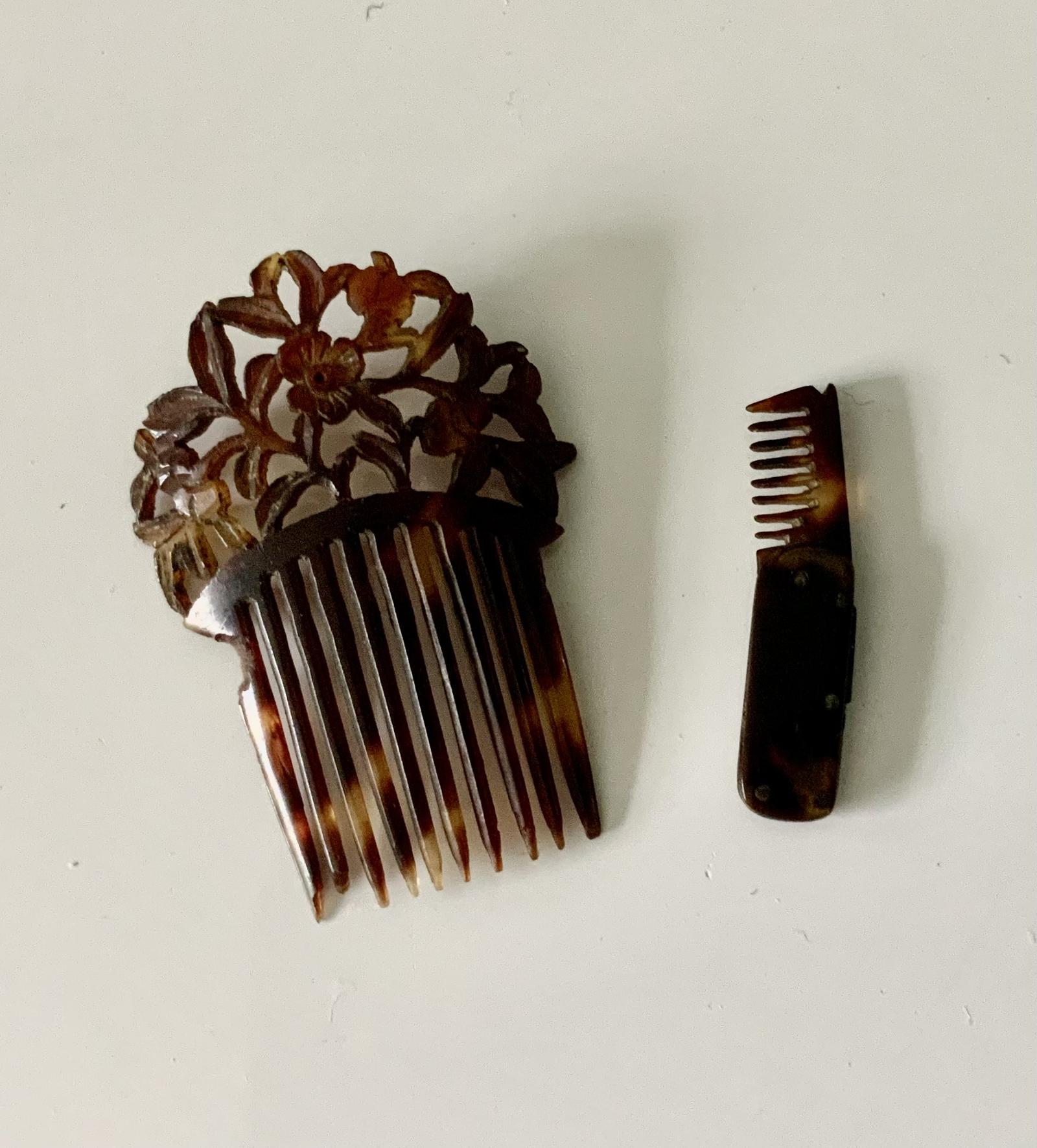 19th century tortoiseshell dolls folding comb and hair comb. The folding comb opens and shuts well. There is a very tiny nibble to one side of the comb, but rare survivors. Please note these items cannot be shipped outside the UK.