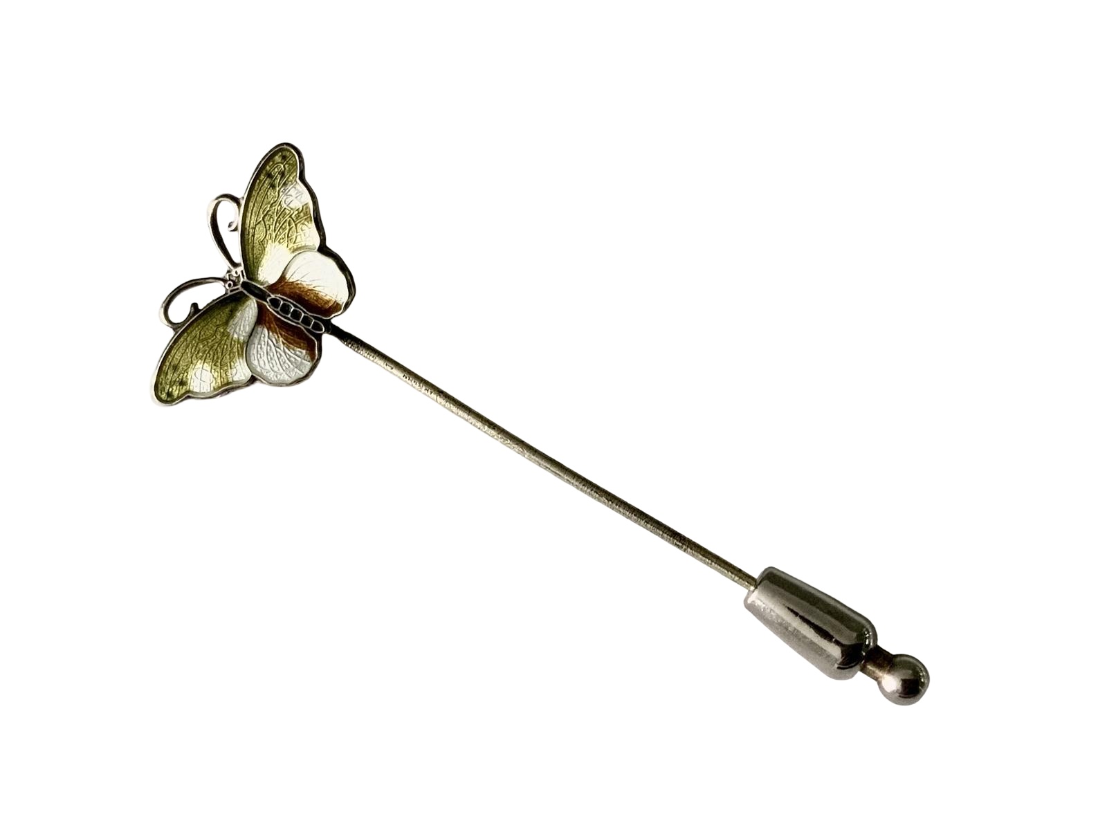A beautiful enamel and silver Norwegian lapel pin in the form of a butterfly. Both the reverse of the butterfly and the pin are marked. Looks like the makers mark for Hoar Prydz. In super condition no damage to the enamel.