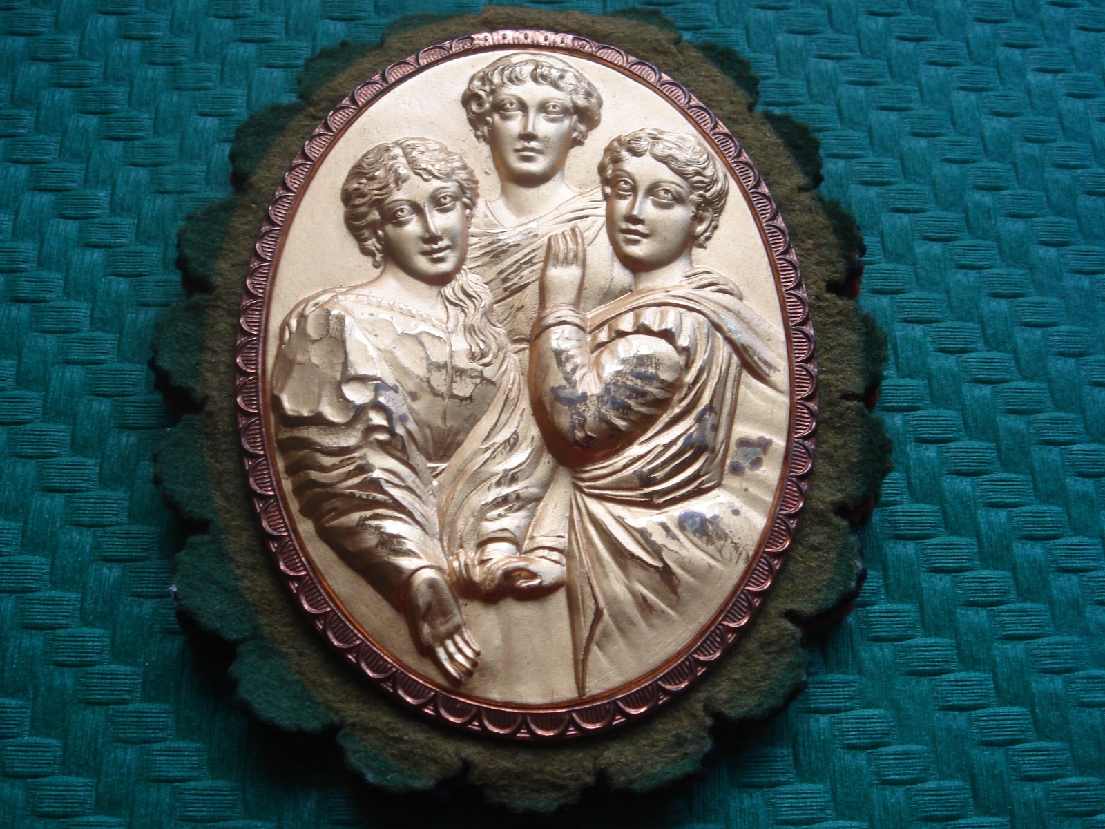 The felt backing of 4 layers is overlaid with a metal plaque which has been gilded and I am pretty sure this depicts the 3 Bronte sisters.