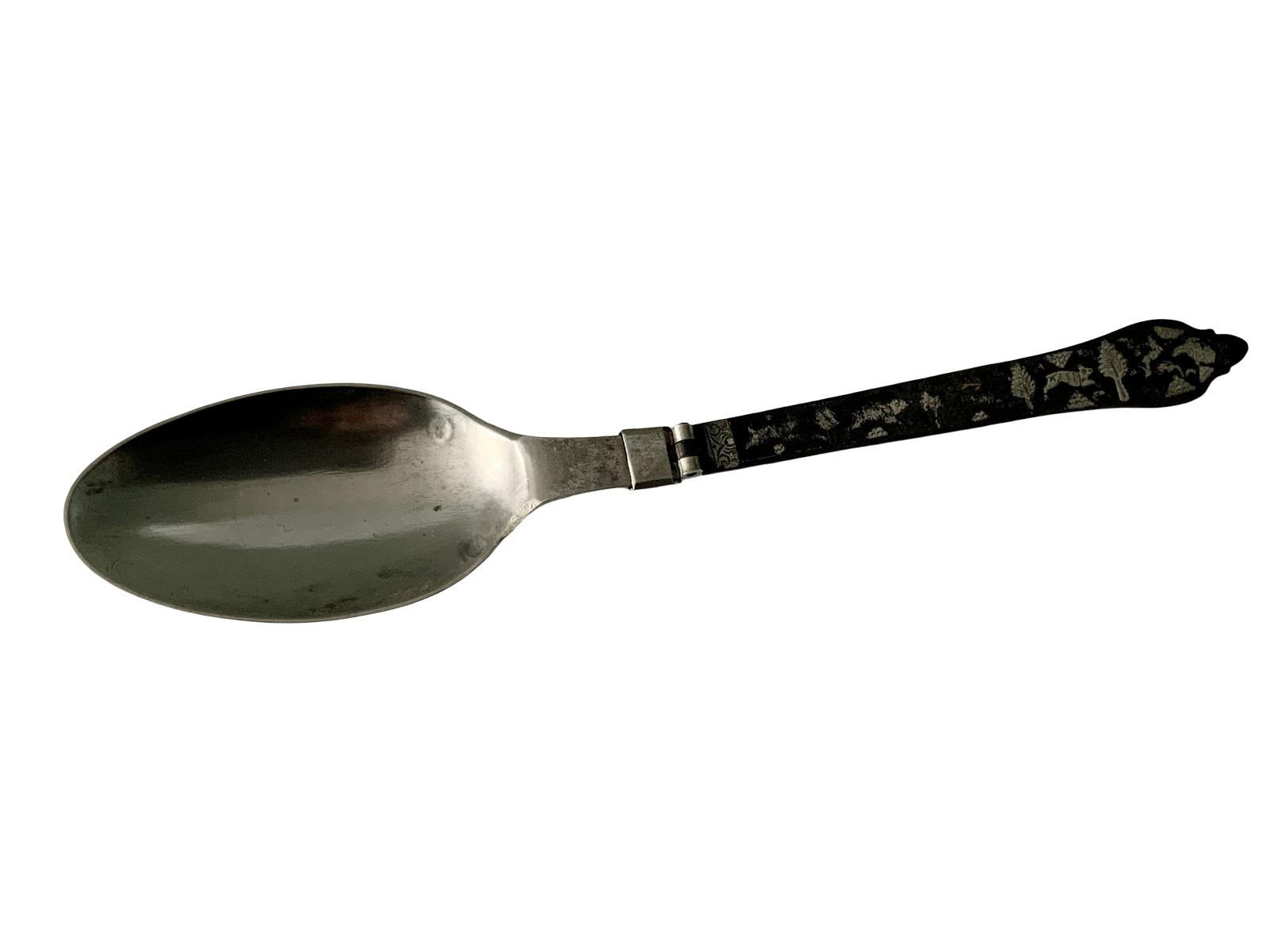 A very rare 17th century folding spoon. The handle is made of iron and inlaid with silver depicting hunting scenes. Some inlay missing and condition commensurate with age and use. The reverse of the bowl of the spoon carries two marks probably makers mark and country of origin mark. Bowl is made of low grade silver. There is a sliding mechanism to hold the spoon in one piece. Originating from Europe maybe Germany or Low Countries.