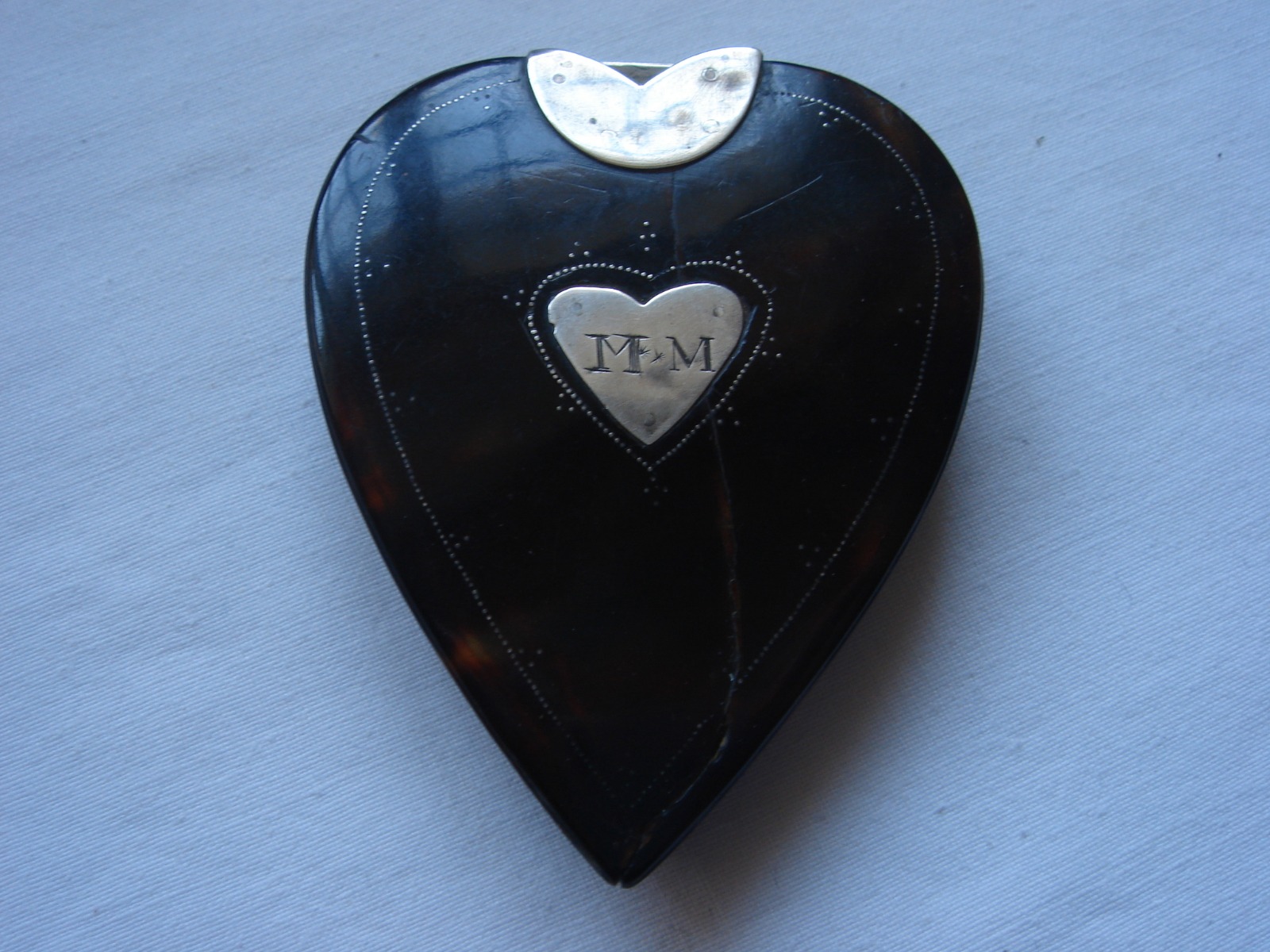 This is a rare little item. Dating from the late 17th early 18th century tortoishell and silver coloured metal. Lovely heart shape, stand away hinge.