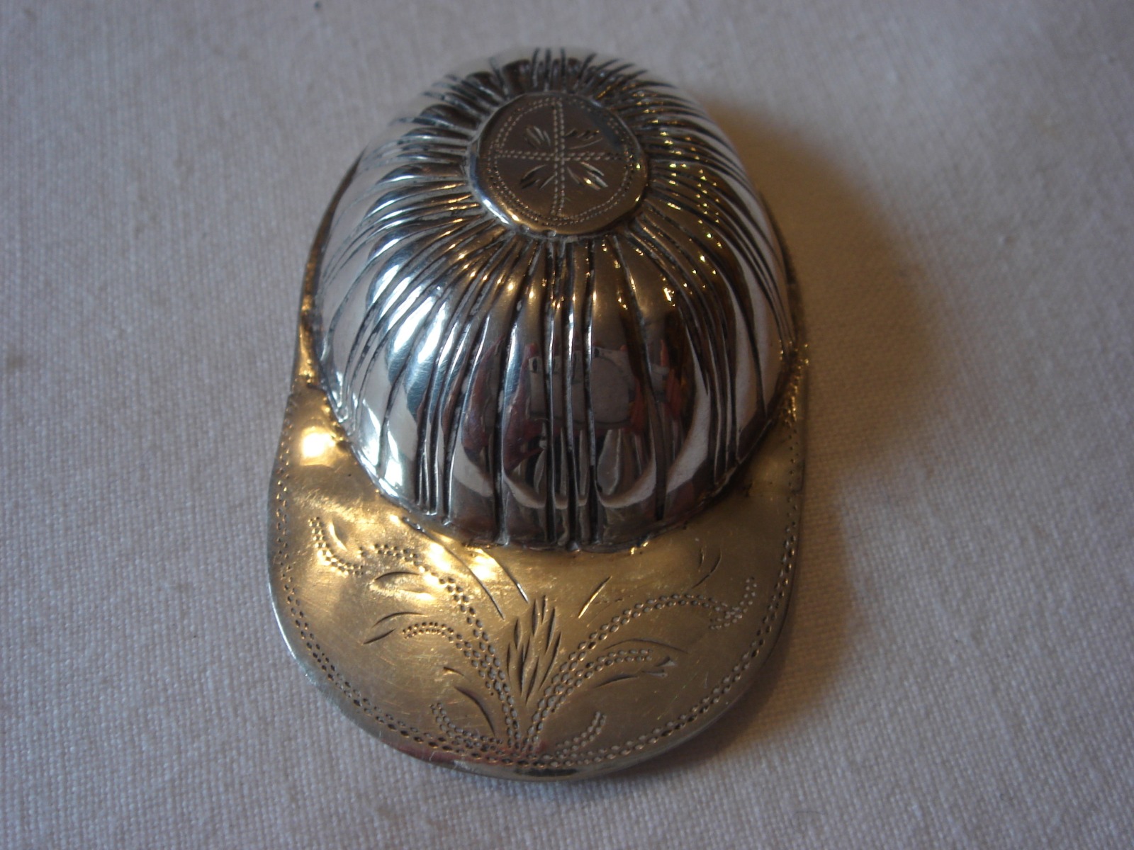 Bright cut decoration to peak of cap on top and underneath.