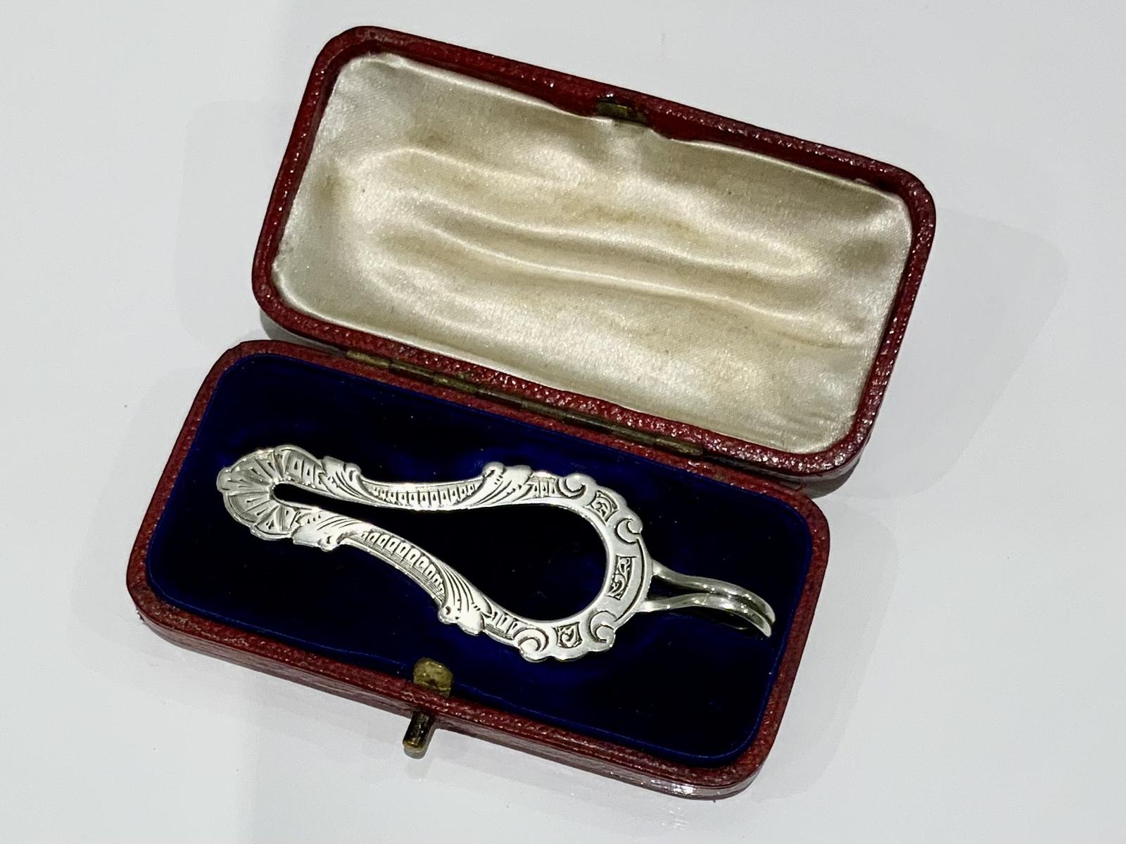 This is a rare design of a silver napkin clip / holder in its original fitted leather box. Marked for Birmingham 1900 William Griffiths & Son. Lovely condition