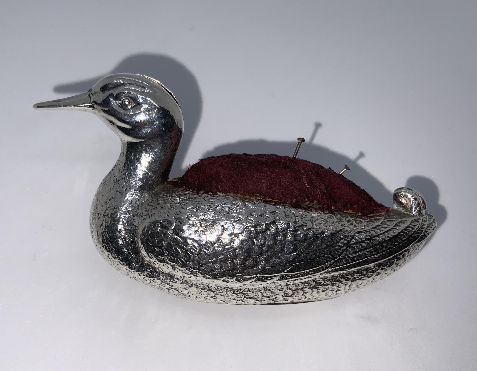 This is a great example of a Mordan duck pincushion, it is a good size and all original. The cushion is the original one although the velvet nap has worn off. Marked on the base Chester 1905. The item is in really good condition the feather decoration is good, there is a slight gap on the back of the neck, but no silver missing.