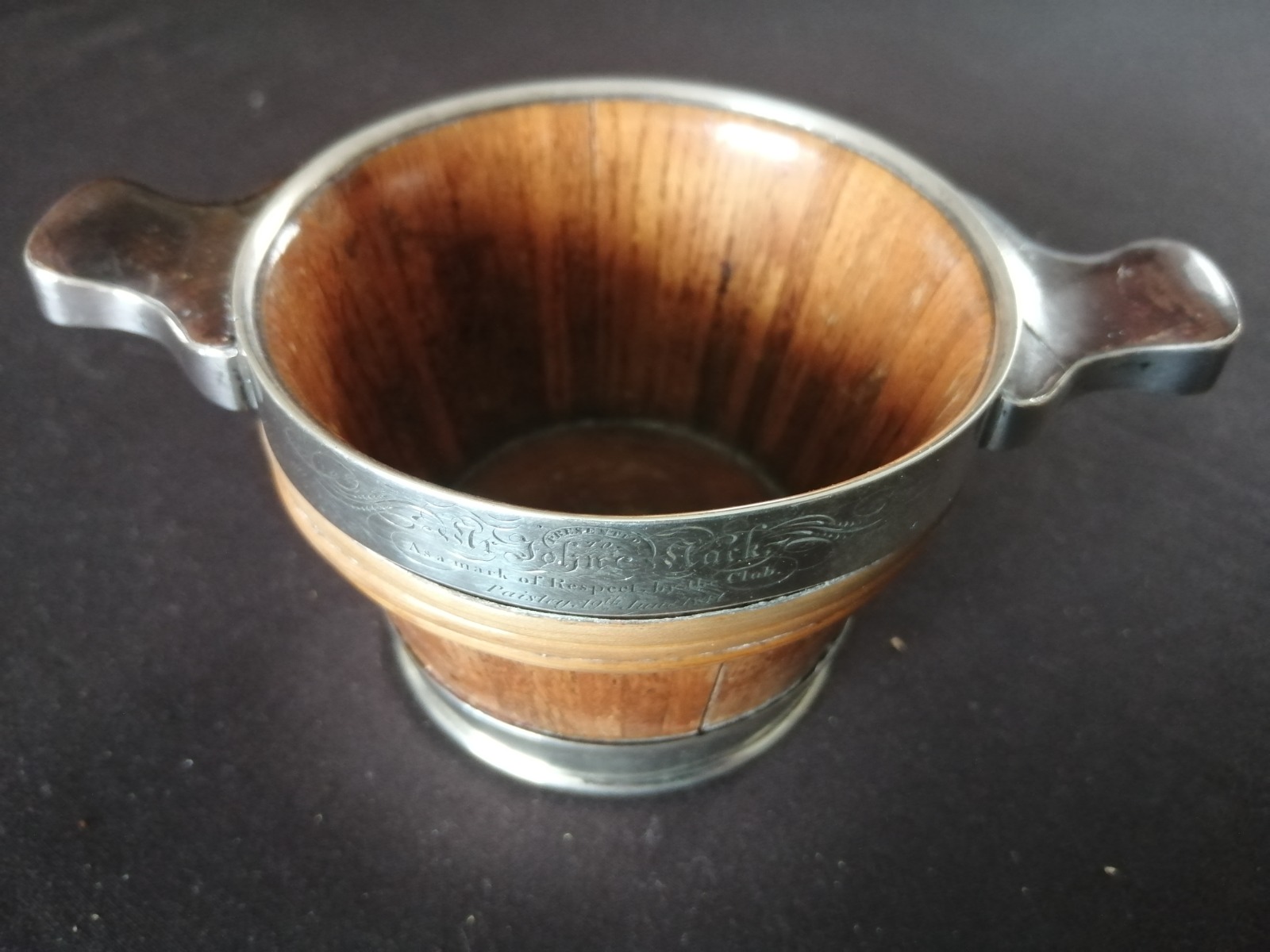 Oak with yew banding silver rim top and bottom inscribed on one side Made from the Wallace Oak of Elderslie Wood of the house in which Alexander Wilson was born and Queen Marys Yew. To the other side presented to Mr John Mack, as a mark of respect by the Club Paisley 19th June 1834.
