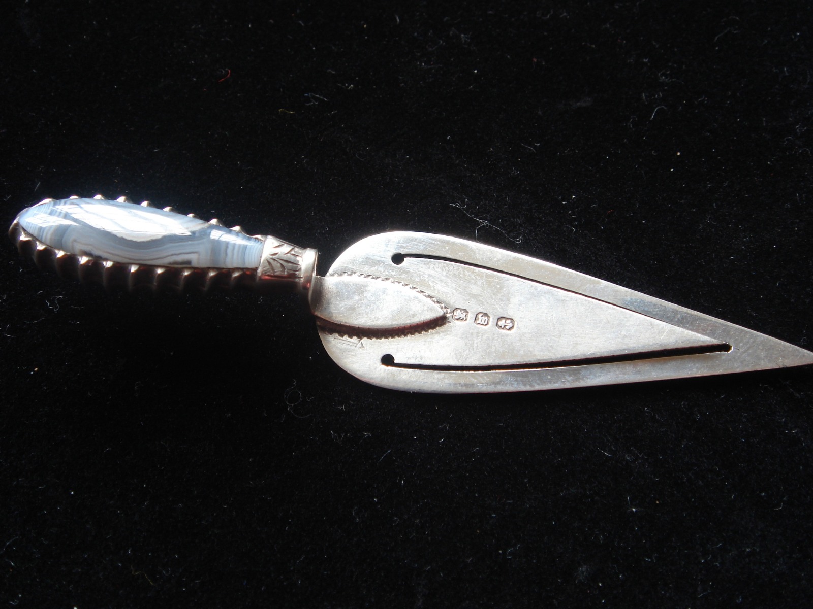 Marked for Birmingham 1896, no makers mark. The grey agate handle has a nice vein in it.