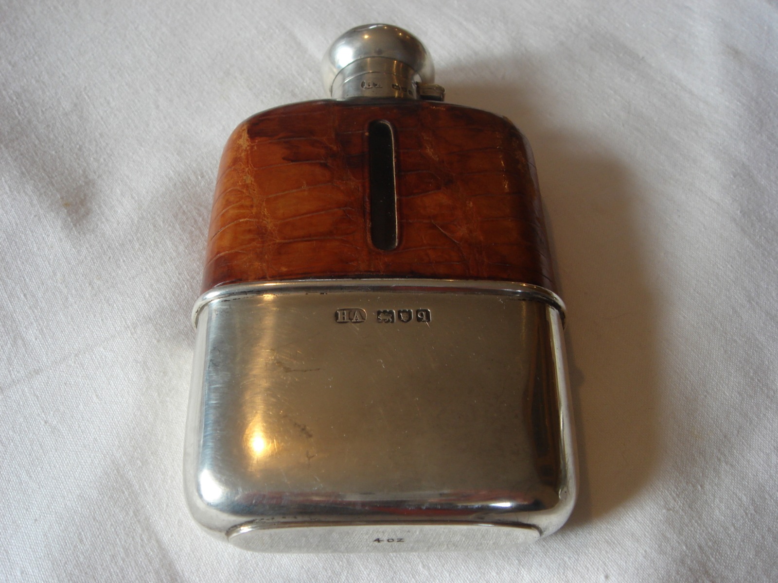 Top Quality solid silver and crocodile hip flask. Marked on the cup (very clear) and on the bayonet opening (makers mark slightly rubbed) London 1911 Atkin Bros