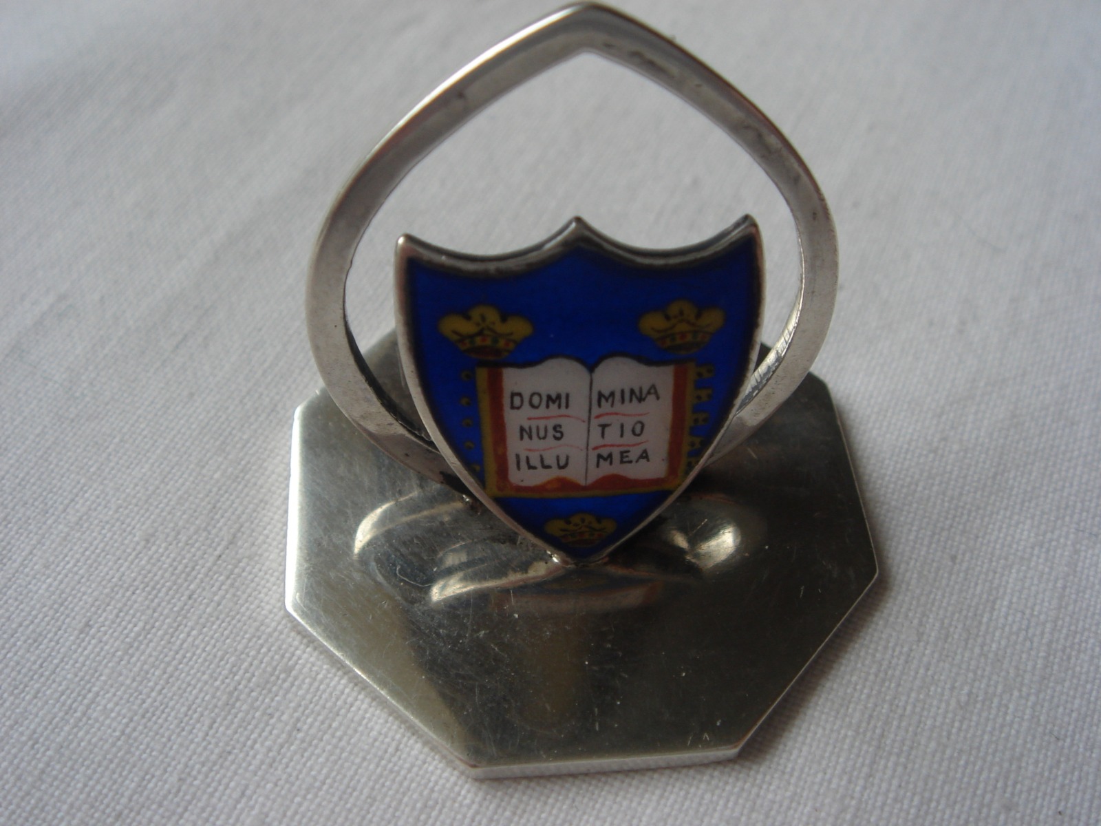 A quality silver and enamel menu holder depicting the Coat of Arms University of Oxford. Makers mark William Barrett Birmingham 1905.