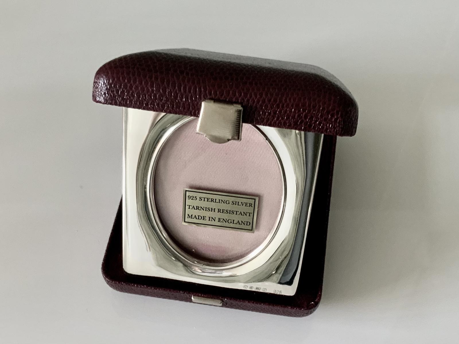 An unused silver travelling photograph frame by Carrs of Sheffield. Encased in a red leather could mock leather case which is in usued condition. Inside the case is lined with red velvet and pale pink fabrics. Marked to one corner Sheffield 1998 made by Carrs.