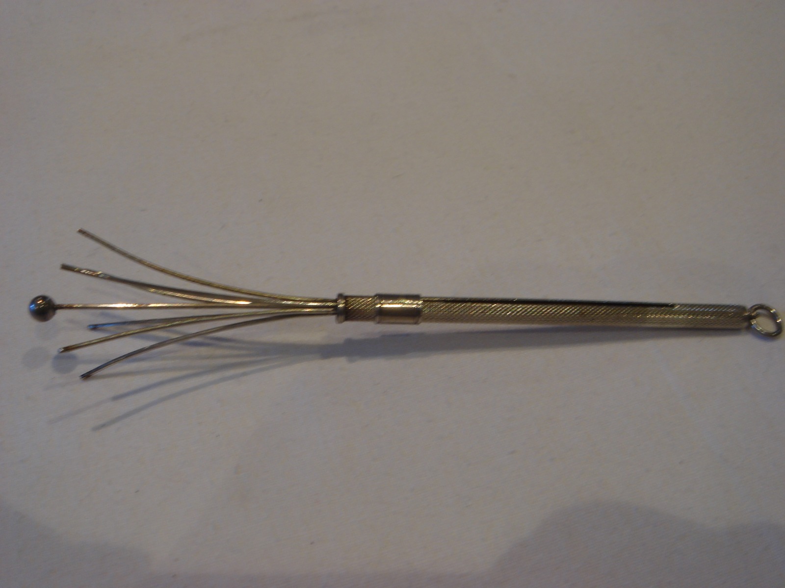 A silver swizzle stick, London 1939. Excellent working condition, owners initials on slider, nice engine turned decoration. Ring at top marked with lion mark.