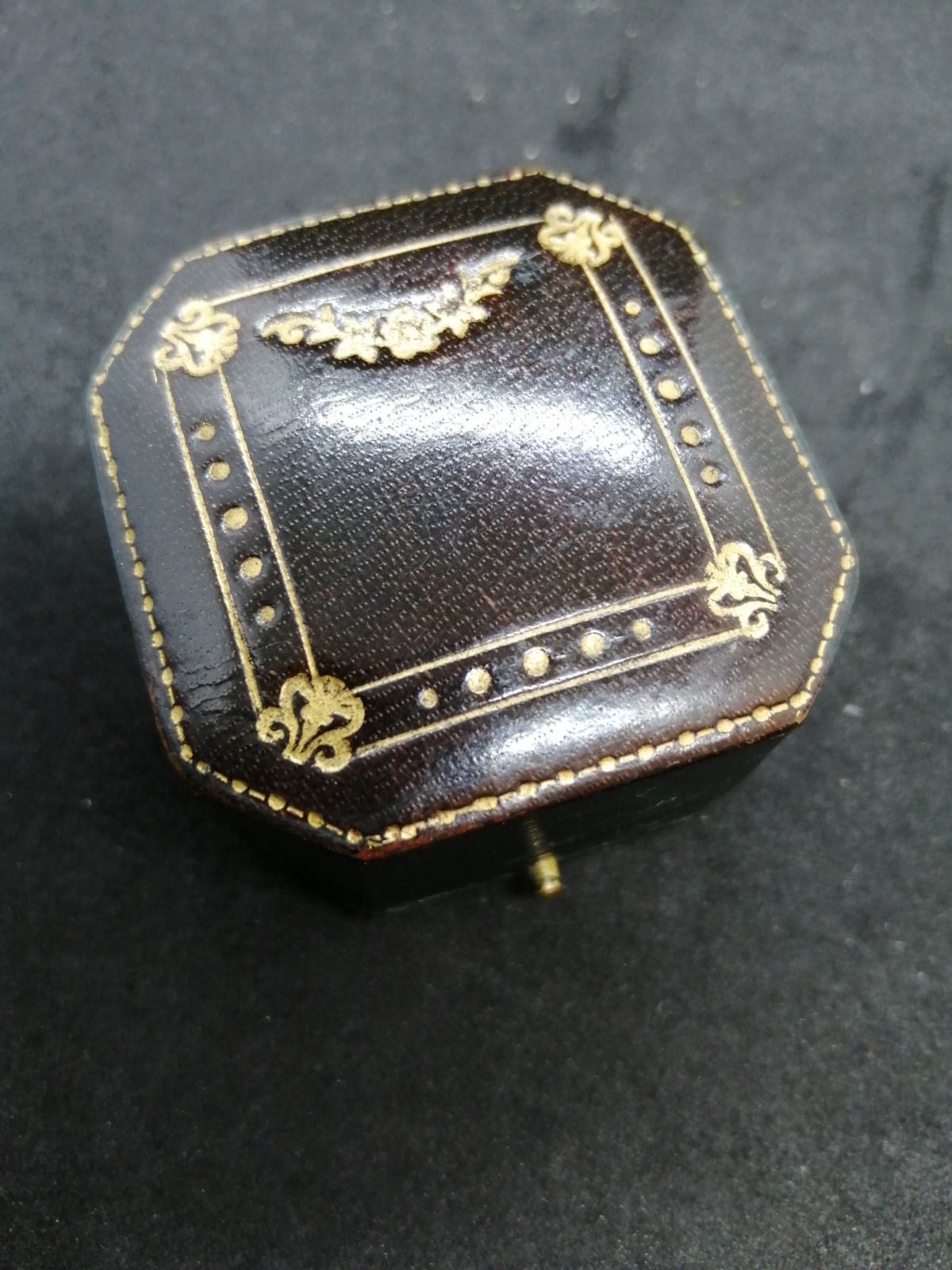 This is a lovely leather gold tooled ring box. The inside is lined in cream silk and brown velvet which is all in ver good condition. The cream silk has been printed in gold with the retailers/makers details but sadly faded.