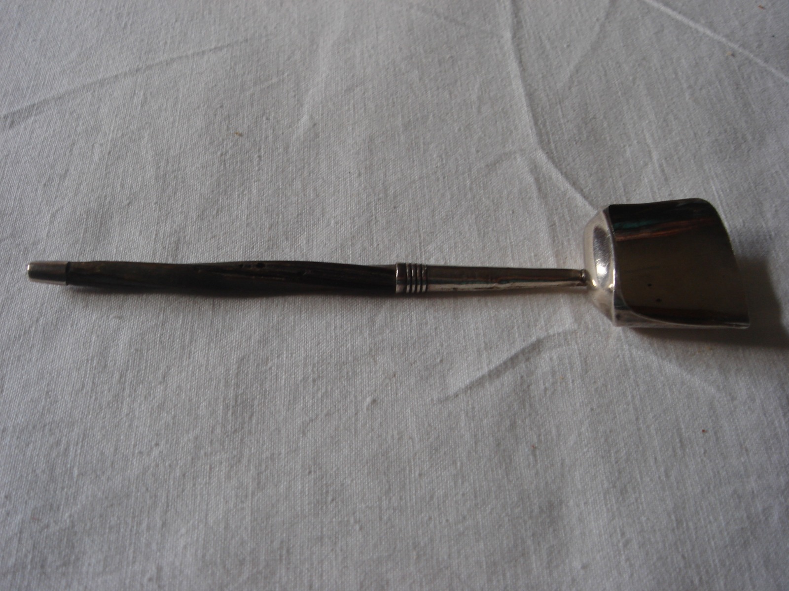This is an unusual long handled silver caddy spoon. The handle is made of Beleen and the silver is marked for Birmingham 1802 makers mark Samuel Pemberton.
