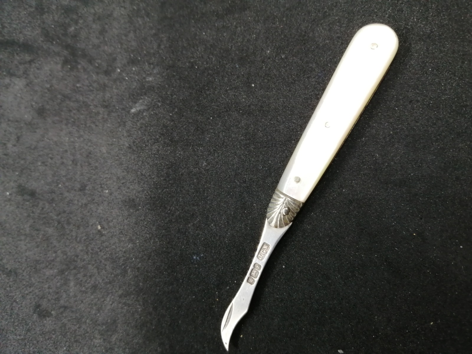 A great little silver and mother of pearl nut pick. It really is a super little item. Fully marked Sheffield 1901 on the silver blade. Makers mark JGW.
