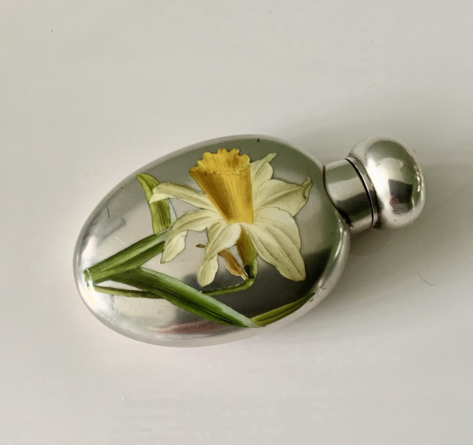 This is a beautiful silver and enamel scent bottle decorated with the most wonderful enamel daffodil. The enamel is in super condition. The silver is also in good order. It still has its original glass stopper and the inside of the lid is silver gilt.